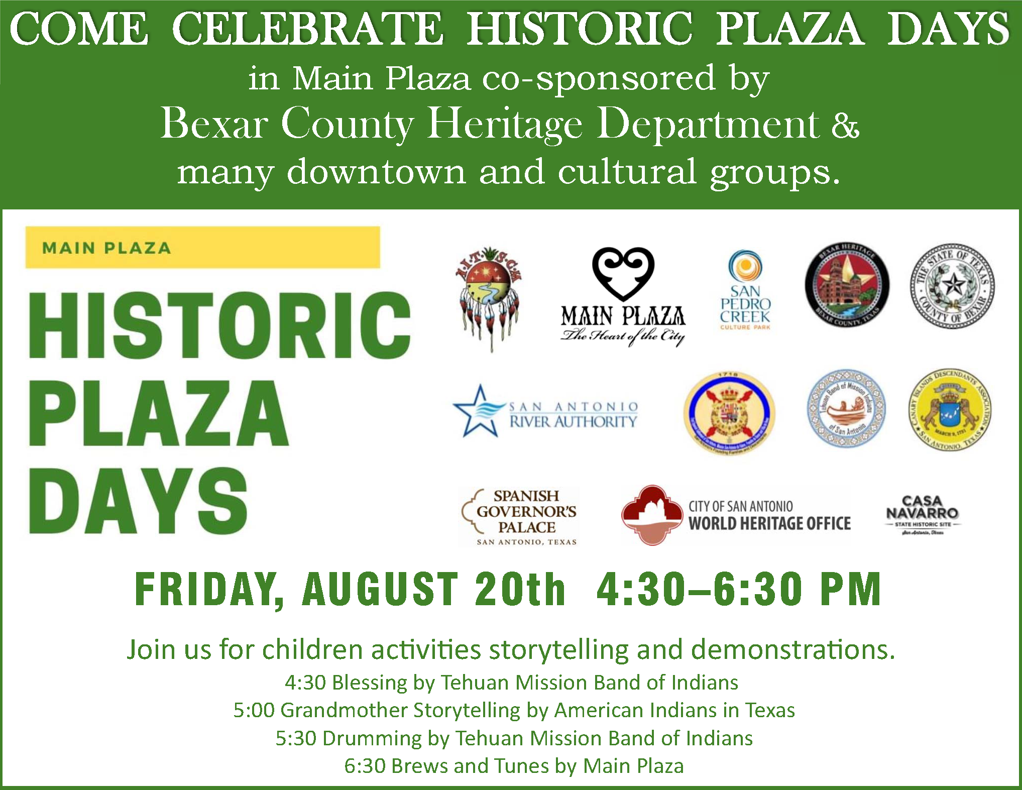 Main Plaza 115 N Main Ave,, San Antonio, tx, United StatesJoin us on Friday, August 29th, from 4:30 - 6:30 PM to celebrate and experience the historical places and people of San Antonio. LEARN about local cultures from Native American, Presidio Soldier, and the Canary Islands descendants' groups. EXPLORE through interactive family activities the local cultural sites, including The Bexar Heritage Center, Spanish Governors Palace,…