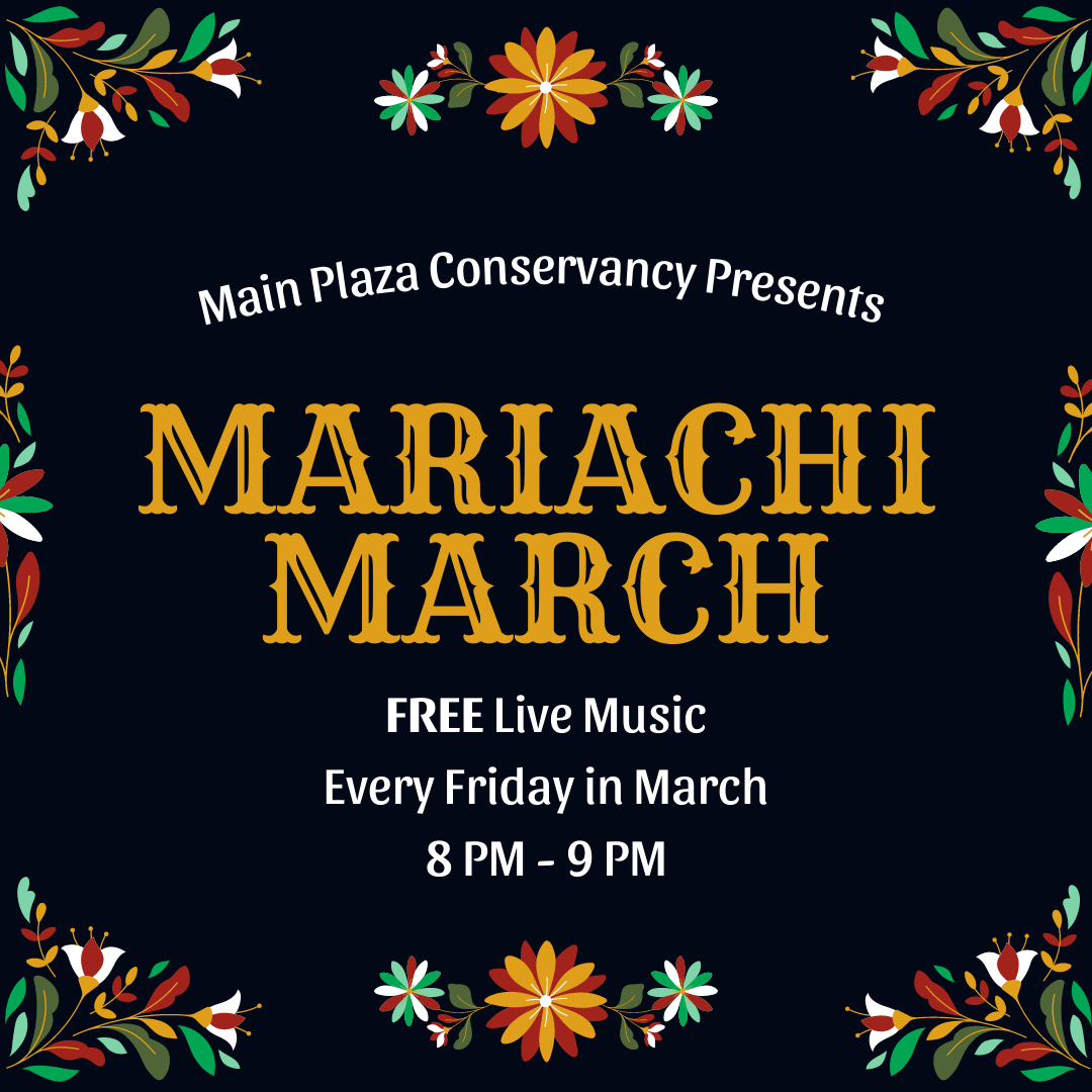Main Plaza 115 N Main Ave,, San Antonio, tx, United StatesMain Plaza Conservancy is excited to celebrate the start of warmer weather with Mariachi March! All month long enjoy free live music every Friday from 8 PM – 9 PM in the "Heart of the City." Dance and sing along to the unique sights and sounds that are San Antonio mariachis. Don’t forget to stay…