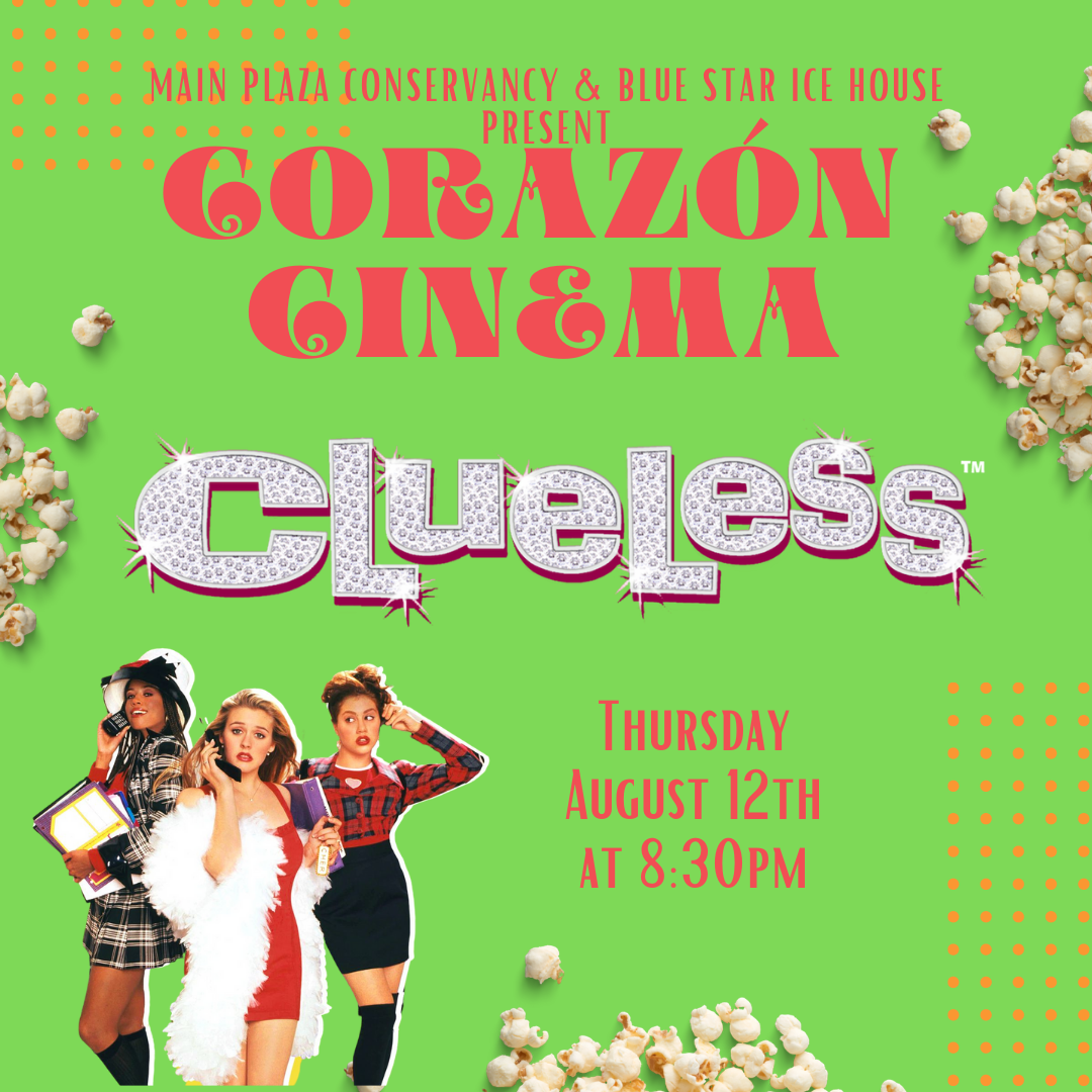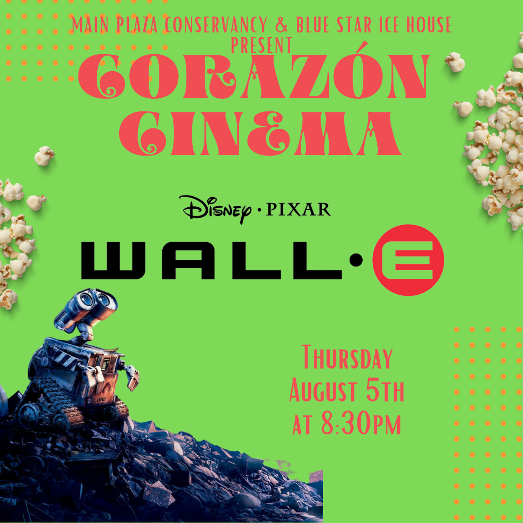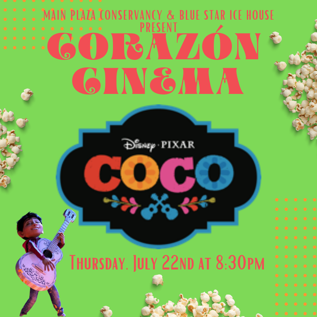 Main Plaza 115 N Main Ave,, San Antonio, tx, United StatesHang out at Main Plaza every Thursday with Corazón Cinema! Each film will start at dusk (approximately 8:30 PM). From throwback favorites to new Disney and Pixar cartoons there is something for everyone. Grab a cold drink with yummy treats from Blue Star Ice House, and enjoy warm summer nights watching your favorite movies. At…