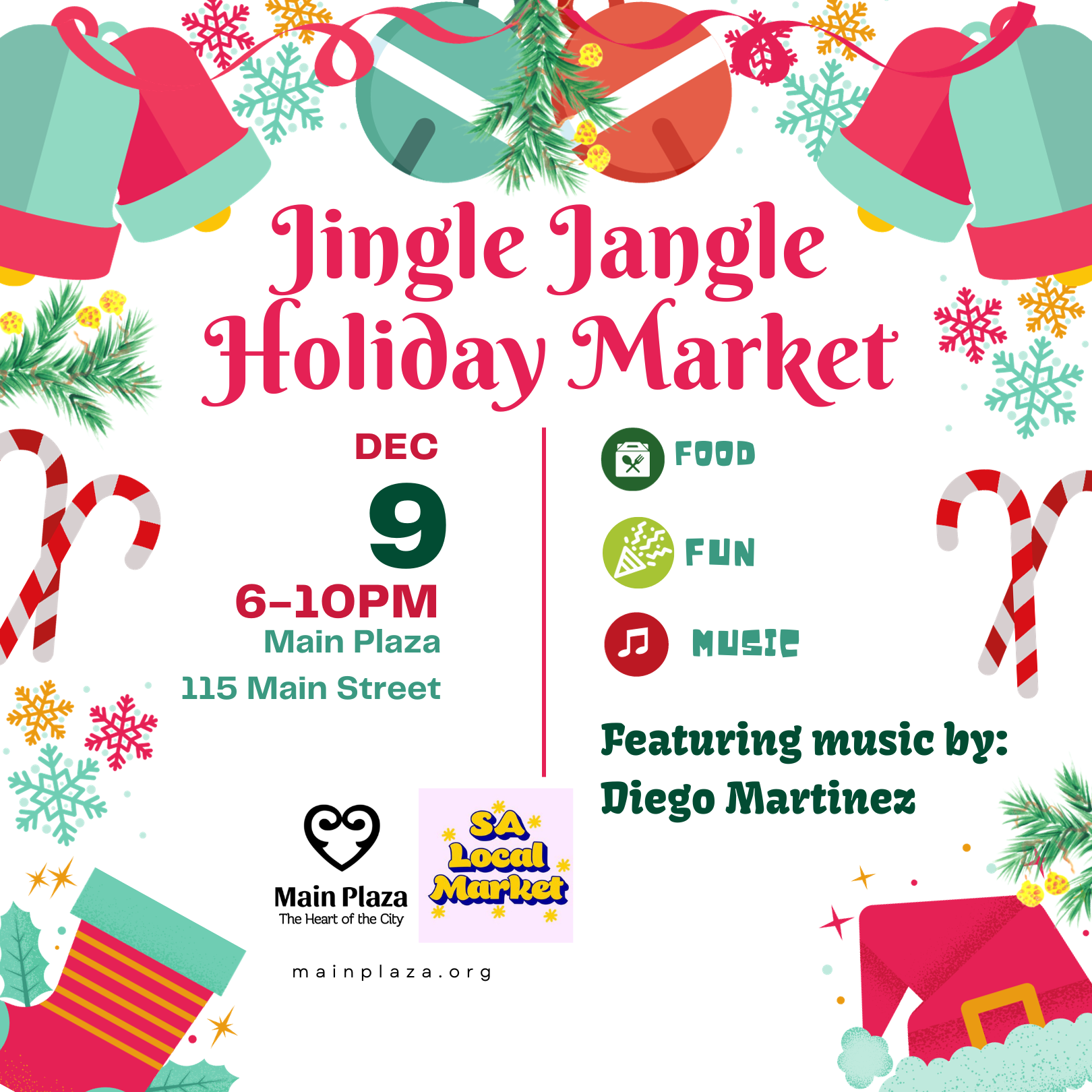 Main Plaza 115 N Main Ave,, San Antonio, tx, United StatesIn the midst of the holiday chaos, bring your family downtown for a lovely stroll amidst the lights and beauty of Main Plaza. While you're at it, you can shop local for Christmas! This market plans to be a special treat with SNOW for the kiddoes and the rat-pack sounds of Diego Martinez!