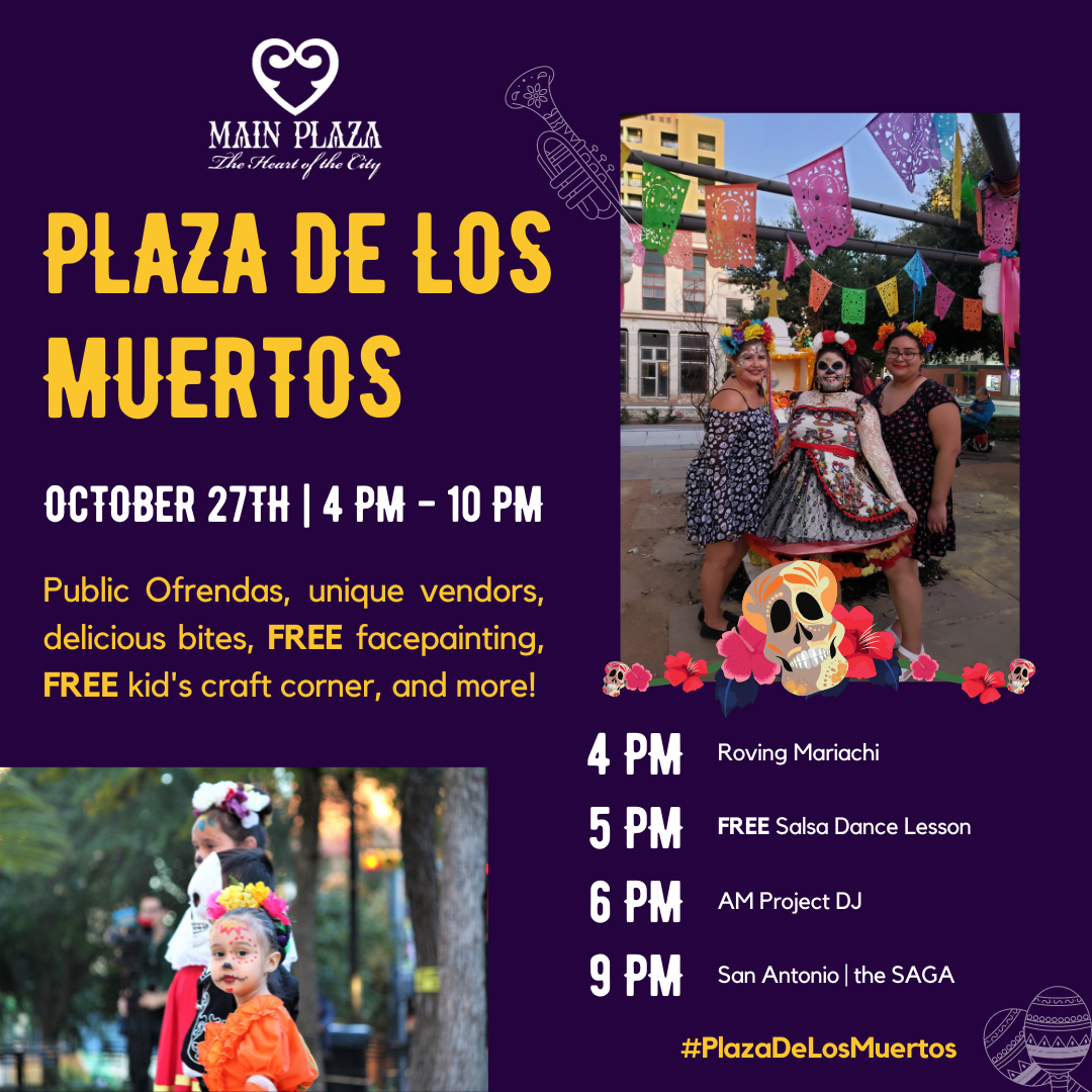 Main Plaza 115 N Main Ave,, San Antonio, tx, United States¡ Bienvenidos a Casa! Celebrate the season and the memory of your loved ones at Main Plaza! Explore unique local vendors, dive into delicious snacks, and take a moment of reflection at the unique ofrendas stationed around the Plaza. Join us for a FREE salsa dancing lesson from 5 PM - 5:45 PM. Stop by…